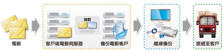 將帳戶所有接收的郵件儲存至備份電郵伺服器,聯通國際於每次服務合約到期後以速遞形式發送硬碟給客戶。費用如下: