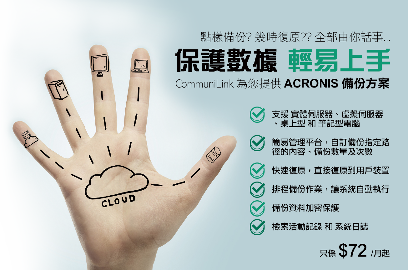 Acronis Backup 支援實體伺服器、虛擬伺服器、桌上型和筆記型電腦,用戶可透過管理工具程式將備份的資料儲存在雲端資料中心。用戶可以將整個系統、檔案或資料儲存為完整的備份影像,進而保護您的資料。